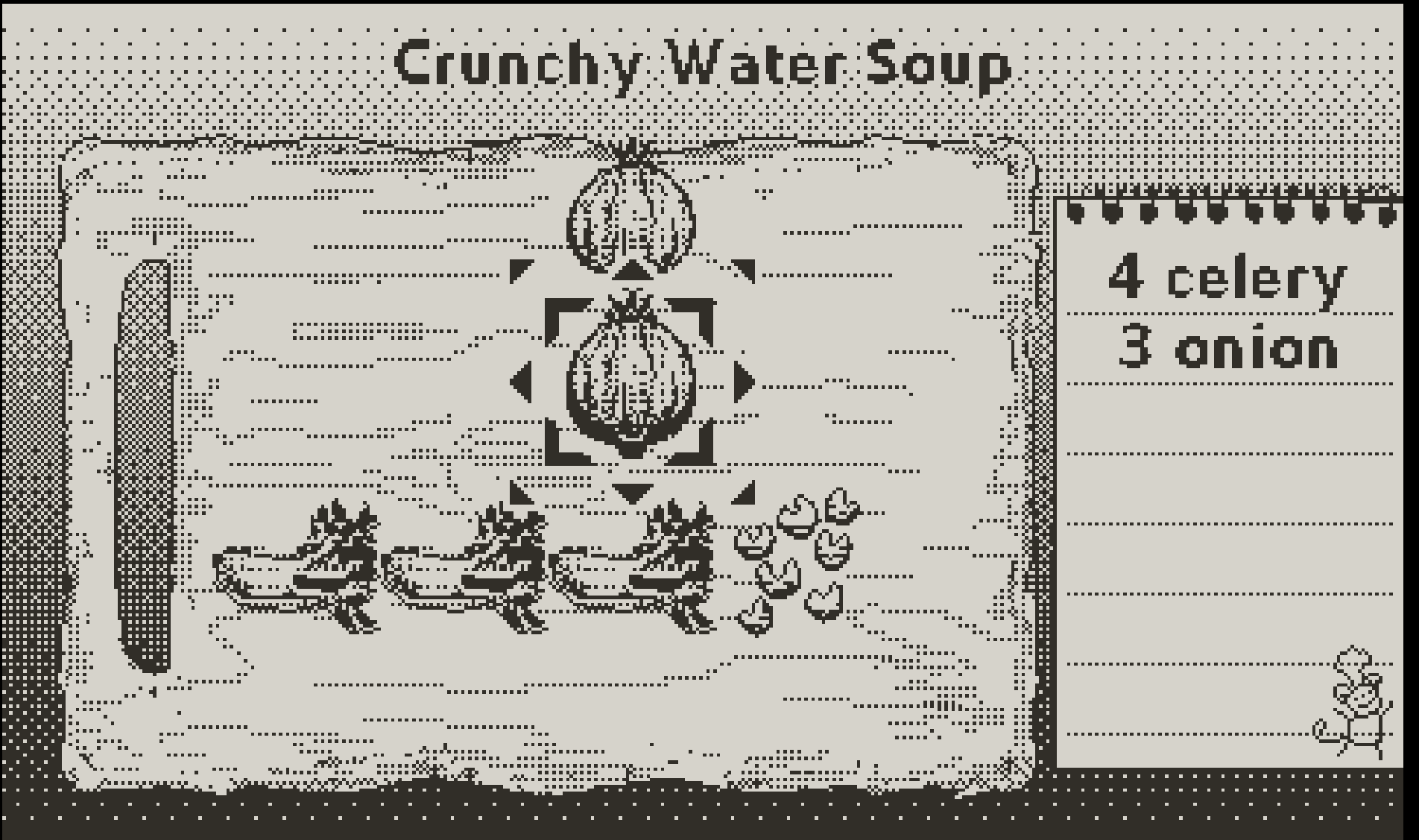 To satisfy the local woodland critters, you'll need to master the art of tactical dicing. Each vegetable has a unique dicing pattern that will push other vegetables across the cutting board. Maneuver ingredients perfectly to shove them off the board and into the soup below.